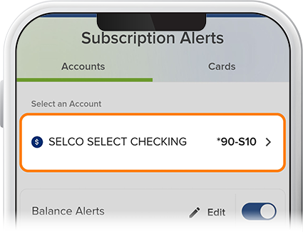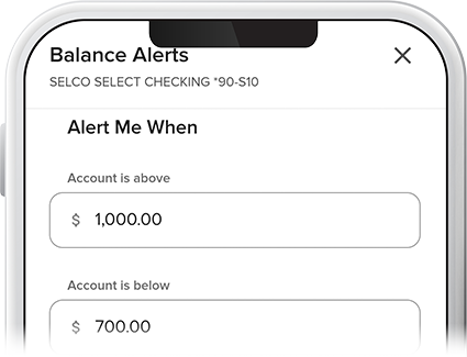 From here, you can set alerts for balances (pictured), pending ACH transactions, loans due, and more. These alerts can be sent once a threshold is reached or recurring until the amounts are within the threshold.